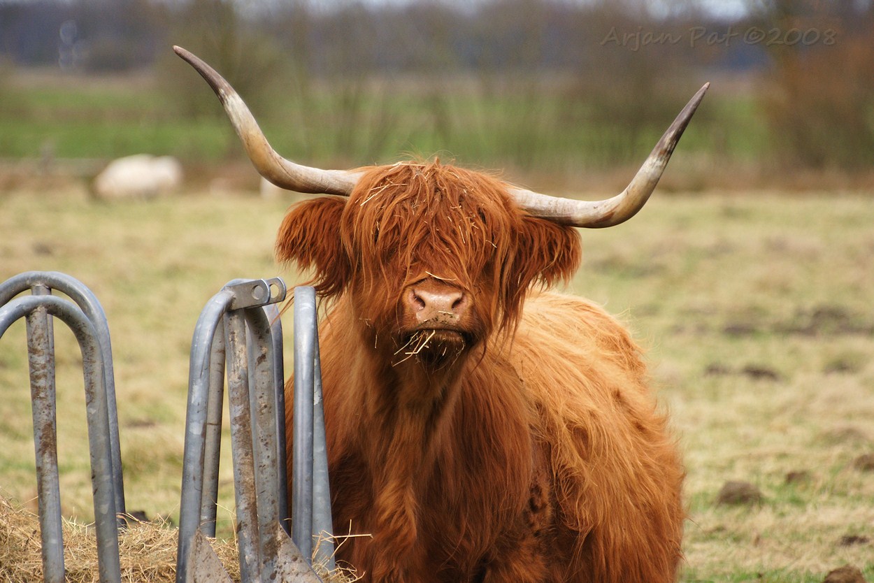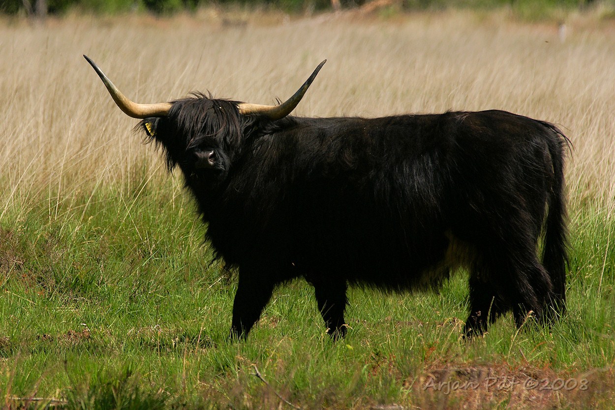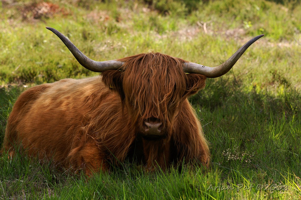 Schotse hooglander herkauwend in de schaduw van een Grove den, midden op de hei.
