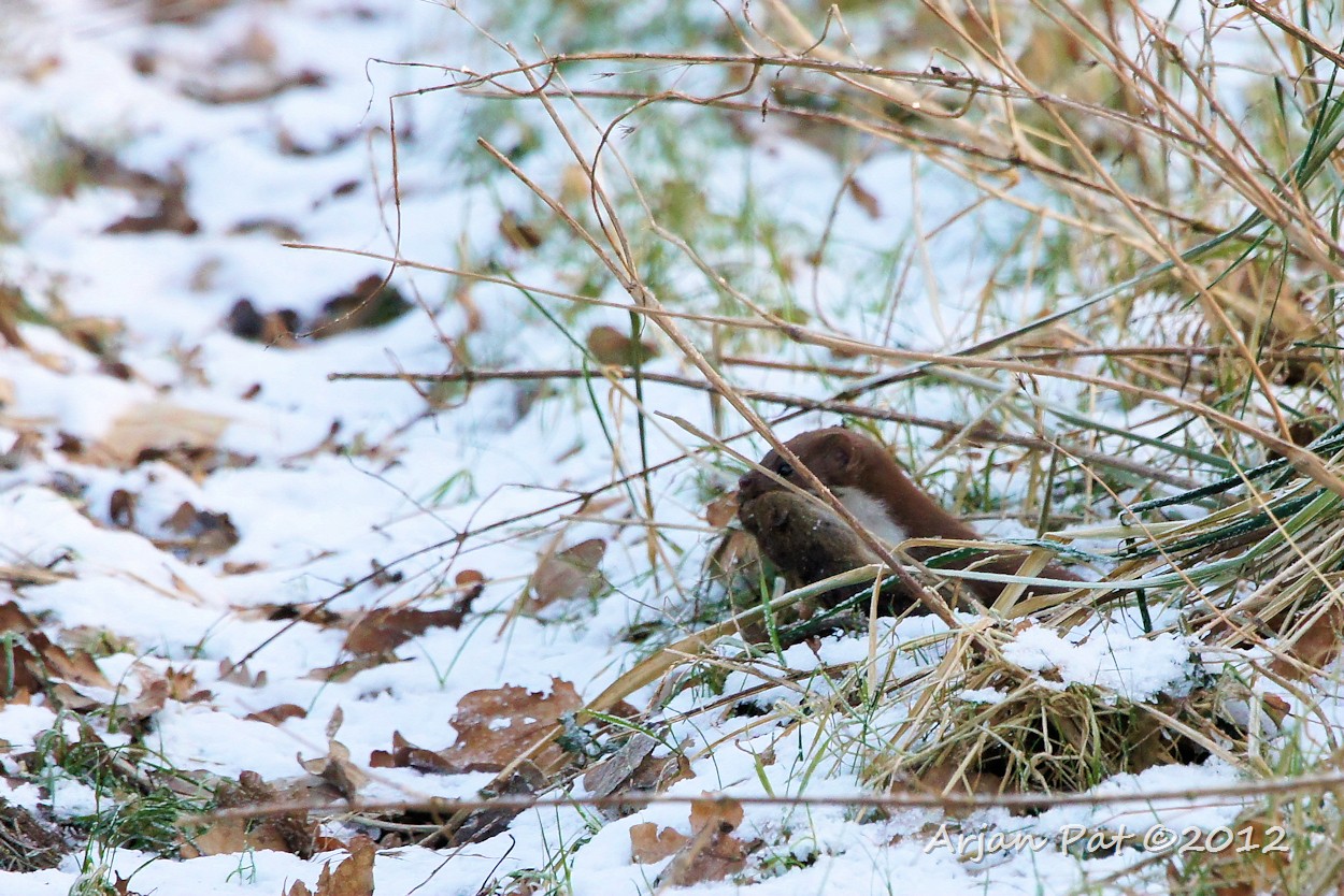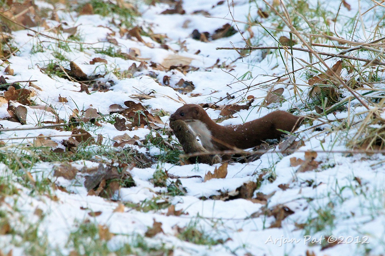 Wezel met een zojuist gevangen (woel)muis of kleine rat.